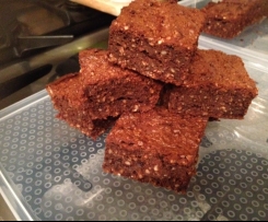 will be brown and coming away from sides, centre should still look a bit wet when done but feel firm to the touch, leave on bench to cool for 15 mins before inverting and slicing into approx 15 squares- should be very chocolatey and moist and not overly sweet.