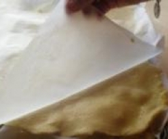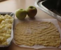 With the remaining mixture, press out on to a piece of glad bake the size of the tin. Once you have the desired shape turn upside down and place on top of apples and peel off the glad bake. Prick with a fork and sprinkle genoursly with raw sugar.