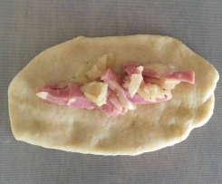 Knock down dough, and cut into 4 even amounts. Using one ball of dough at a time, roll into an oval shape and cut into smaller even amounts. I make about 6-8 for each roll. (Slightly bigger is easier to handle to begin with)