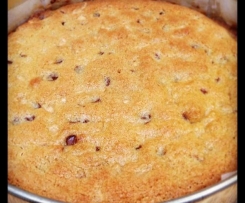 This cake is AMAZING! It is more like a giant cookie than a cake. Adapted from Sprinkle Bakes Overloaded Peanut Butter Chocolate Chip Cookie Cake. Cake pictured is decorated with halved Reeses Mini Peanut Butter Cups, Reeses Peanut Butter Chips, and grated chocolate. Reeses products are available at USA Foods and Sugar Station. The cake would be great alone too.