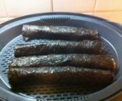 5. Place a piece of fish along one edge of the Nori sheet. Sprinkle with salt, pepper, spring onions and roll up to completely encase it. Place into Varoma dish and set aside. Repeat with remaining fish, Nori and spring onions.