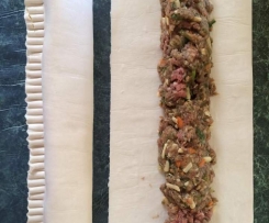 "Counter-clockwise operation" /speed 3 stiring with the spatula to make sure it is all combined well.4) Cut each sheet of pastry in half and spread out the mixture lengthways in the centre. Fold over and seal with a little egg yolk and by pressing down with a fork.