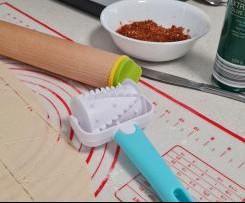 5. Place one piece of dough between two sheets of baking paper and roll out to 2-3mm thick (flipping the dough and adjusting the baking paper to ensure the dough is even).