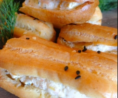 Spoon the choux pastry mixture into a piping bag with a large star nozzle. On one or two baking trays lined with silicon paper, pipe the Eclair in 5cm long straight lines, allowing enough space between for them to double in size without touching.