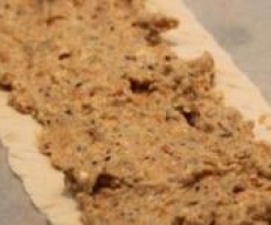 4. Cut one sheet of puff pastry into halves and lay the first half onto prepared tray. Score around the edges of one half (see picture) and spread half of the cream cheese mixture into the centre of the scored piece. Slash the top sheet of pastry and place on top of the cream cheese mixture then score edges again to seal. Repeat with second sheet of puff pastry.