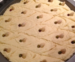 Preheat oven to 170C fan-forced or 190C conventional. Butter a shallow baking tin about 30cm x 30cm - square or round. Add all the ingredients into the TM bowl except for the blanched almonds and pistachios. Mix for 1 minute on speed 6. You may have to stop after 30 seconds and scrape down the sides of the bowl. The batter will be very thick. Spread the batter into the prepared baking tin, pushing it flat with a spatula. Cut through into a diamond pattern about four centimetre shapes and dot each diamond with a pistachio and an almond. Bake for 35 minutes or until golden. While the cake bakes, make the syrup.