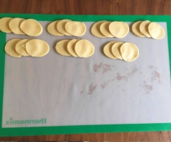 "Dough mode" 2 min. Transfer to a clean bowl or Thermomix leave to rise 30 minutes or until dough has doubled in size. - Degass the dough. Roll out dough to the size of the thermomat and cut circles using an 8cm cookie cutter.