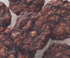 Pinch out handfuls of batter and roll into ping-pong ball size cookies.  Very slightly flatten them before spacing them wide apart on the baking trays and cook for 10-15 minutes.  When they are done they will have spread into big, flattish, but still squidgy discs.  They will feel soft to the touch but will harden a little (not too much) as they cool.  Once cooked, remove cookies from the oven and stand on the trays for 30-60 seconds.  Then remove with a thin spatula or palette knife to a wire rack to cool.
