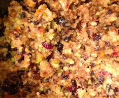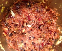 Add juices of orange and lemon, honey, sultanas, cranberries, currants, coconut sugar, spices, vanilla essence and Grand Marnier.