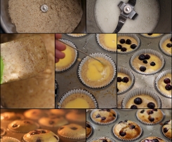 Divide mixture between prepared pans and top each with a dollop of lemon curd. Swirl through the batter with a skewer. Scatter with blueberries.