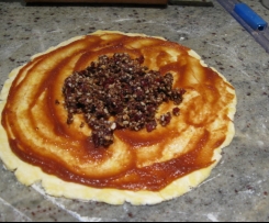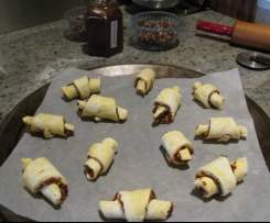 To assemble take one disk at a time from the refrigerator, roll dough to a 23 cm round. With a spoon spread a thin layer of apple butter onto the pastry round. Scatter ¼ of the nut mix onto a round. Place a piece of baking paper over nuts and lightly press into the dough. Cut dough into 12 wedges. A pizza cutter works well. Be careful not to cut mat if using. Roll from the wide end to the middle to make croissant shaped pieces. Place on ungreased baking sheet and return to the refrigerator. Continue with each disk of pastry.