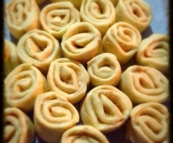 starting at the log edge, roll up into a log and cut into 1 inch sections and place onto prepared tray. Repeat steps with 2nd half of the dough