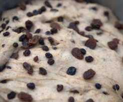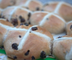 The inspiration for this recipe comes from "The Cook The Baker" book by Dean Brettschneider - a kiwi baker. These are the hot cross buns that are made in Zarbo in Auckland. They are so popular that at Easter time they can't keep up with demand When you have made them you will understand why. It is a good idea to have your sultanas and currants pre-soaked and can be kept for three weeks in the fridge. These Hot Cross buns are loaded with fruit so if you prefer less adjust accordingly.