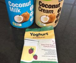 It is important to clean your utensils and sterilise your jars before you start to eliminate unwanted bacteria. The quality of your coconut milk, coconut cream and probiotic powder will influence the end product. Be sure to source coconut milk and coconut cream with NO stabilisers/thickeners, etc, just coconut (I have included a picture of the ones I use). Also be sure to source a good quality dairy-free probiotic as this will influence the flavour of the final product (picture also included).