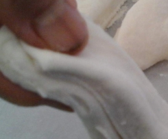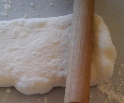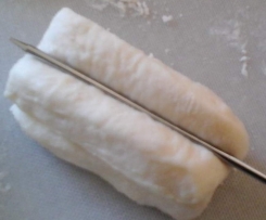 Dust flour into ThermoMat, divide into 2 portions, roll out half cm thickness into a rectangular shape. Use flour to prevent sticking
