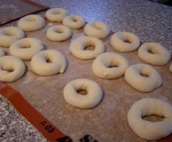 Thank you for the recipe they turned out really well . I made round balls and put a floured finger through the centre until it touched the mat . You then just rotate the ball like a hula hoop and get perfectly formed bagels