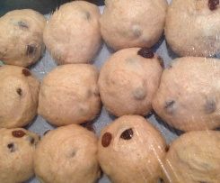 Place buns into the preheated (180deg) oven and cook for 15 mins. Then brush milk over and place back into the oven for a further 20 mins or until buns are a rich golden brownDescribe the preparation steps of your recipe