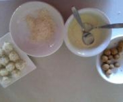 7. 7.  To assemble, roll mixture into small balls, approximately the width of a 10 cent piece.  Dip into melted chocolate (I coated them using two spoons) using just enough for an even coating then roll and coat in the shredded coconut.  Set aside and repeat until all balls are coated.