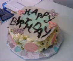 6. Remove from tin and decorate to your preference. Whipped cream is always nice to break the sweetness a little. The one in the picture was then decorated with discs of white chocolate coloured and cut to shape, and some extra pistachios.