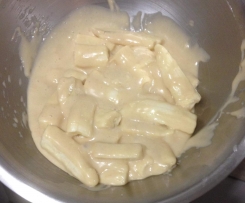Peel and cut bananas into quarters. Place into a bowl and pour batter over the bananas