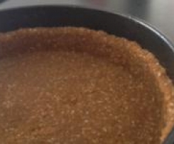 Tip crumbs into prepared pan and pack firmly. Take a little extra time here to get the base and sides nice and thin and even. Use a glass to get a good corner and gently press down the top all the way around so its an even height – needs to be about 3cm high.