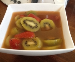 Add all ingredients except fruit. Cook 5 minutes 100 degrees speed 2, add peeled and cut into 1/2 or 1/3 rds kiwifruit and set on reverse