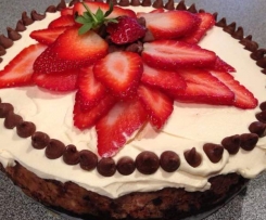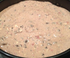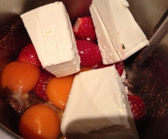 Place raw sugar and chocolate buttons to bowl and grate 5 second speed 8. Scrape down sides of the bowl. Add cream cheese (cut into smaller portions) and 250 gram punnet of hulled strawberries (retain a couple for decoration), and eggs to the bowl. Beat 1 min speed 6. Scrape down sides and mix for further 5 secs speed 6