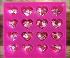 1. Sprinkle a little of each candy decoration into each compartment of a love heart chocolate mould tray.