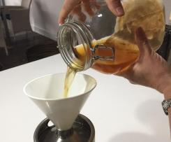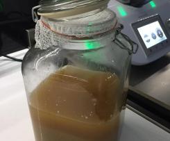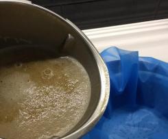Now sieve the mixture through a muslin cloth, coffee filter or very fine mesh into an extra bowl. Make sure you filter out all the chunks. - Transfer the liquid back into your Thermomix bowl and fill it up with the rest of the water to the max mark (2 or 2.2l - depending on your TM model).