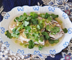 Once cooked, transfer the fish and ginger onto a platter and scatter the fish with the julienned spring onions. Reserve 150g of the steamed fish juice from the TM bowl and pour on top of the fish. Disregard the remaining juice.