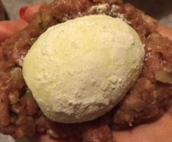 7. Divide the mixture into 6 even portions. Mould a portion in the cup of your hand and place a hard boiled egg into the cup and shape meat around to cover egg. Role it to smooth surface.