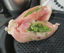 Cut pocket in side of chicken breast and insert even quantities of the basil mixture into each breast and place in Varoma.