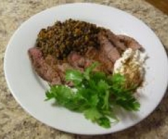 10. To serve; Cut the lamb across the grain into 1cm slices, place a mound of lentils in the centre of each plate, arrange 6-8 lamb pieces around the lentils and serve with a dollop of thick Greek yoghurt (or Raita from the Indian Cookbook) and a sprig of coriander.