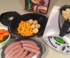 Add the sausages to the top tray of the varoma and place on top of varoma bottom basket. Put the lid on. (Place a bit of baking paper underneath the sausages if you don't want any "drippage")