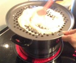 Boil water in a big sauce pan and place a pizza baking tray (one with holes in it) on the top of it.