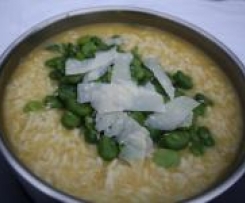 Bring a pot of salted water to boil on the stove top and cook the broad beans for 5-6 minutes. Drain and tip the beans into a bowl of chilled water. Drain again, then pop the beans out of their skins (whilst the risotto is cooking) and set aside.