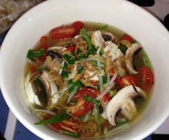 Meanwhile slice chicken thinly. Divide noodles between 4 bowls top with slices of chicken, the spring onions,, crisp shallots, chilli, beansprout, mushrooms and tomatoes. Pour over the hot broth then sprinkle with coriander to serve.