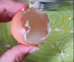 Tap the larger end of the egg so it forms slight cracks, do it gently as you dont want to smash the shell. Peel back small sections of the egg shell at a time. keep going until your egg shell resembles something like the picture, a hole about the size of a 50c coin. Turn upside down onto plate/ toast etc and it *should* plonk right out. If it doesnt you can either peel back little bits more shell at a time, OR you can run a spoon around the inside and manouver it out that way. It may take a few times before you master the egg plonking hehe.