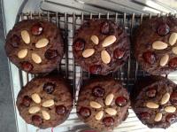 Put in a baking paper lined cake tin with newspaper wrapped around the outside and tied with string - this will prevent the sides from overcooking and drying out. Decorate with Blanched Almonds and Cherries.