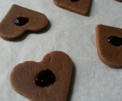 Place cut biscuits on a baking tray with baking paper, about 3cm apart. Add a small amount of your prefered jam to the small indentation. I used a mixed berry jam.