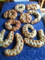 Cook in a 200C oven 15 min for rolls, 20 - 30 min for braid and loaf. Check if done by tapping loaf. It should sound hollow.