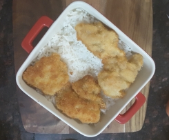 Coat seasoned chicken peices in flour, dusting off excess flour, coat in egg and then coat in panko crumbs, fry chicken until golden on both sides, set aside on paper towel.